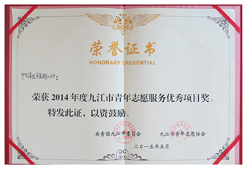 • 2015年5月榮獲九江市十佳志愿服務(wù)項(xiàng)目稱號(hào)