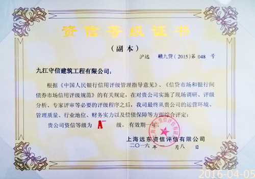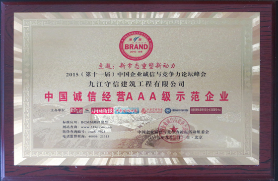 • 2015年9月榮獲全國2015年中國誠信經(jīng)營(yíng)AAA級(jí)示范企業(yè)